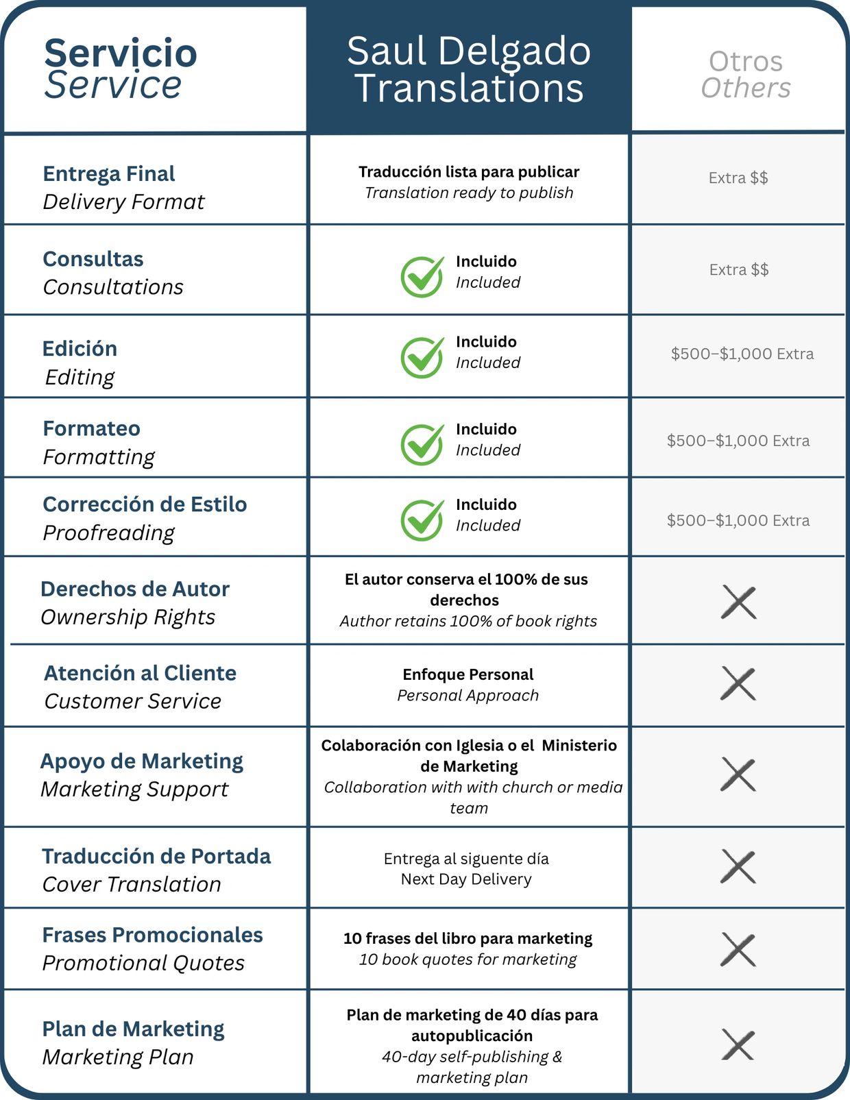 Tu libro, traducido y listo para publicar en solo 60 días. Ofrezco un servicio personal y guiado por la fe, trabajando contigo, tu iglesia y el equipo de marketing para que tu mensaje llegue al mundo.
